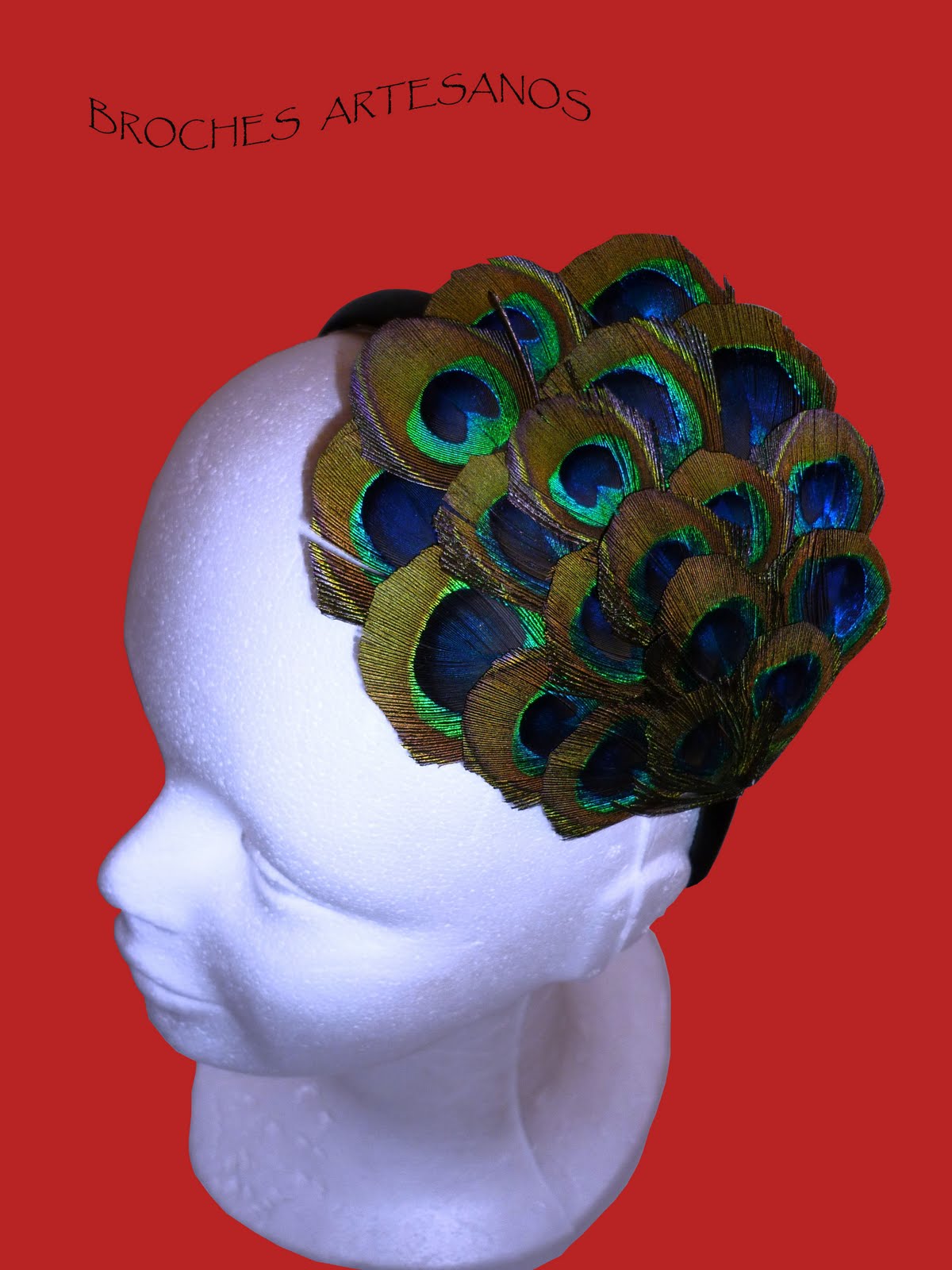 Diadema realizada a mano y con autenticas plumas de pavo real.